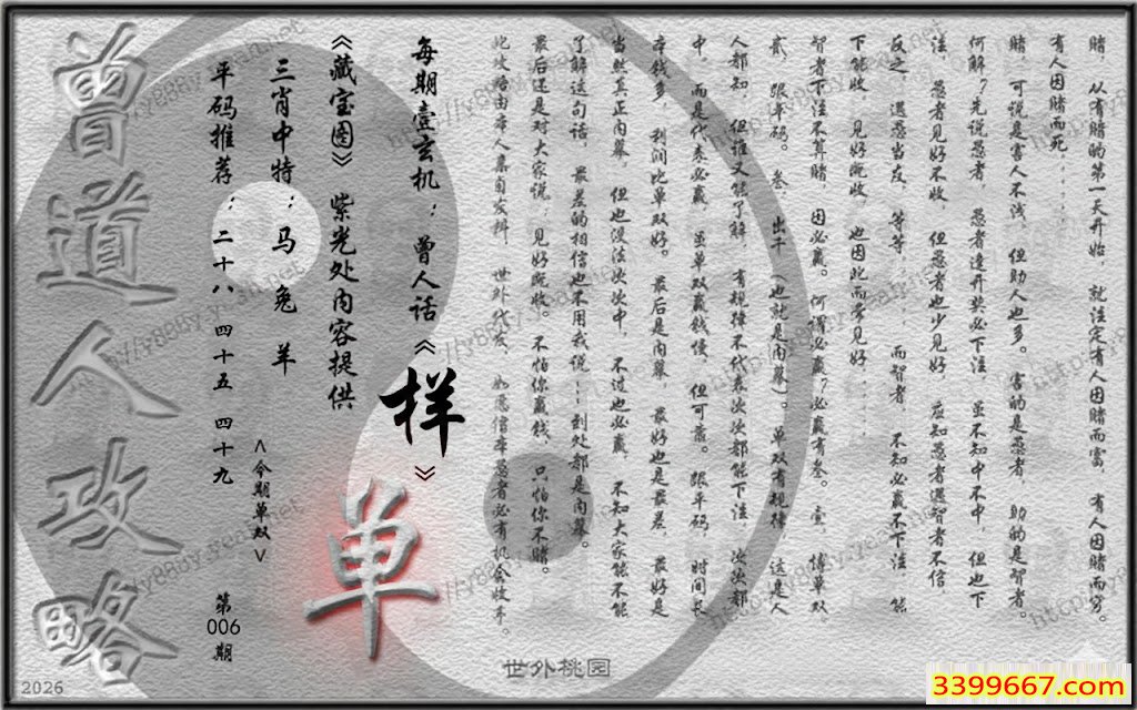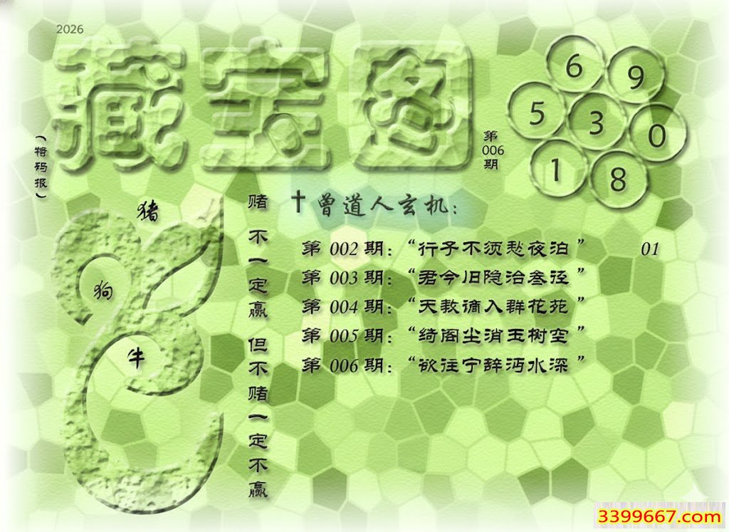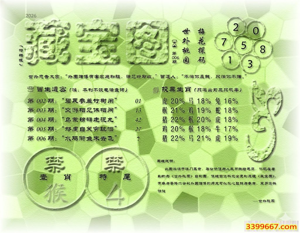 | 主题 :006期藏寶圖 新:欲往宁辞沔水深 老:水鸡衔鱼来去飞 禁:猴 禁:4尾 |